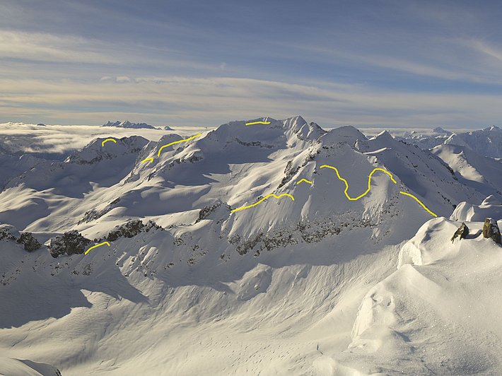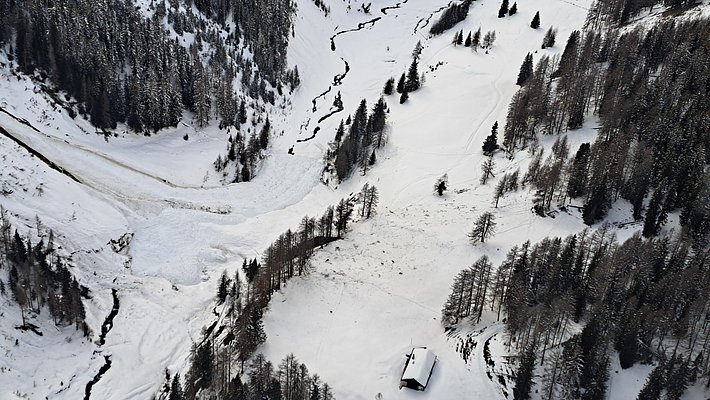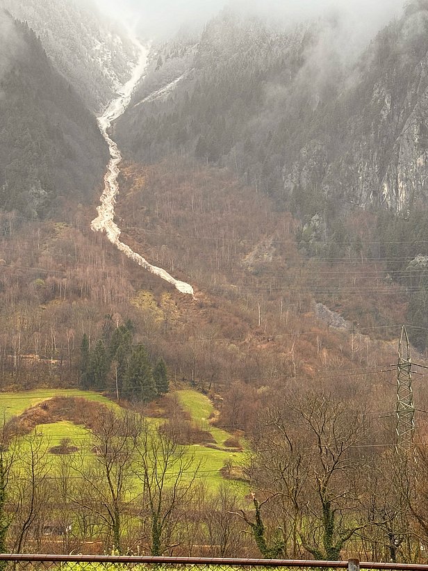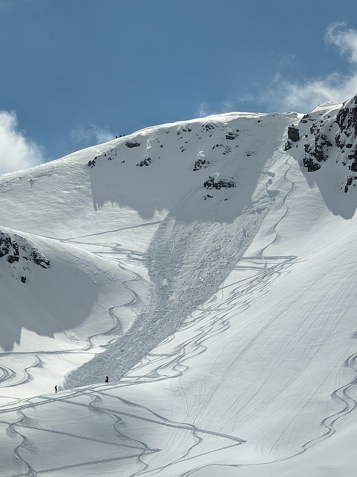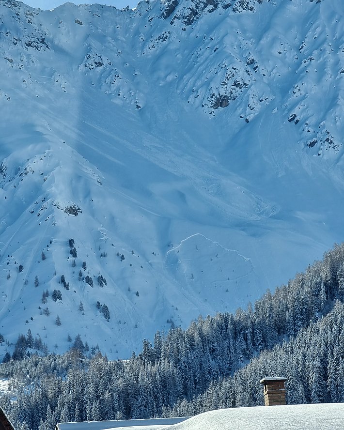 In den angrenzenden Gebieten aber gingen viele sehr grosse Lawinen spontan ab, wobei die Brüche zumindest teilweise im Altschnee erfolgten. Dies galt ganz besonders für die ganzen Vispertäler (Abbildung 11), aber auch für die südlichen Urner Alpen (Abbildung 12), das Bergell und das Oberengadin (Abbildung 13). Im Nachhinein betrachtet, wäre die Gefahrenstufe 4 (gross) deshalb wohl auch noch in weiteren Gebieten angezeigt gewesen.