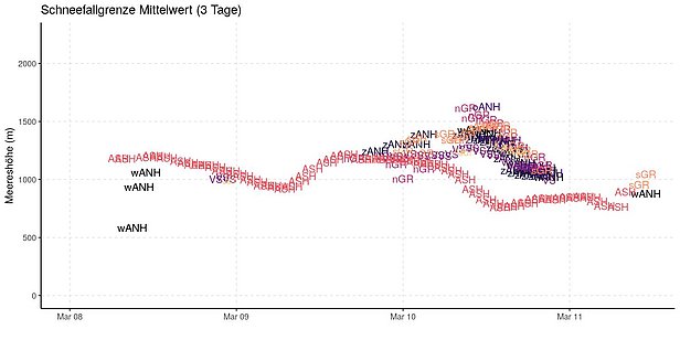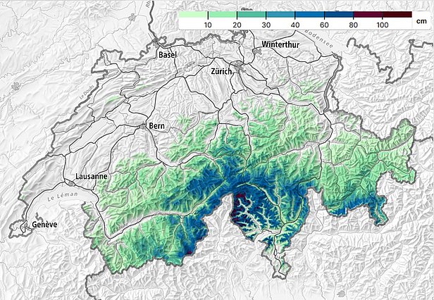 Die Schneefallgrenze lag zwischen 800 und 1600 m (Abbildung 8), in intensiven Niederschlägen sank sie gar bis auf 270 m hinunter (Quelle: MeteoSchweiz-Blog).