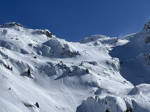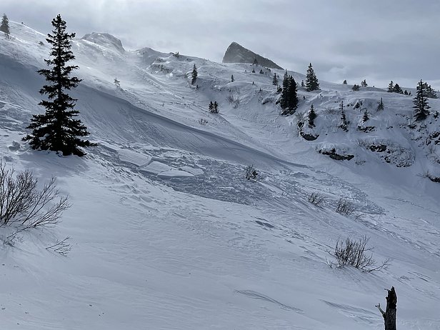 Besonders an Nordhängen lag gebietsweise viel lockerer Schnee von den Vortagen (vgl. oben). Dieser wurde mit dem Sturm intensiv und bis unter die Waldgrenze verfrachtet (Abbildungen 4 und 5). An Südhängen dagegen war in mittleren Lagen bereits eine mehr oder weniger tragfähige Kruste vorhanden. Der Triebschnee wurde in Nordhängen auf lockeren Schnee und teilweise auch auf Oberflächenreif abgelagert und war deshalb störanfällig. Entsprechend wurden am Freitag und Samstag viele kleine und mittlere Lawinen im Triebschnee ausgelöst (Abbildungen 5 und 6).