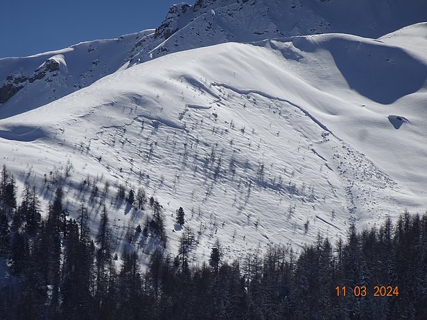 Im Tessin hatte sich der viele Neuschnee von Anfangs März (vgl. letzter AvaBlog) offensichtlich bereits gut verfestigt, und allfällige tiefer liegende Schwachschichten waren mächtig überlagert. Sehr grosse Lawinen mit Brüchen tief in der Schneedecke wurden keine gemeldet. Es kam aber zu vielen Lawinenanrissen am Übergang zum Altschnee oder innerhalb der Neu- und Triebschneeschichten. Dies auch flächig und zum Teil unterhalb der Waldgrenze (Abbildung 10).