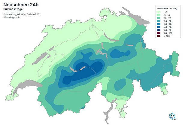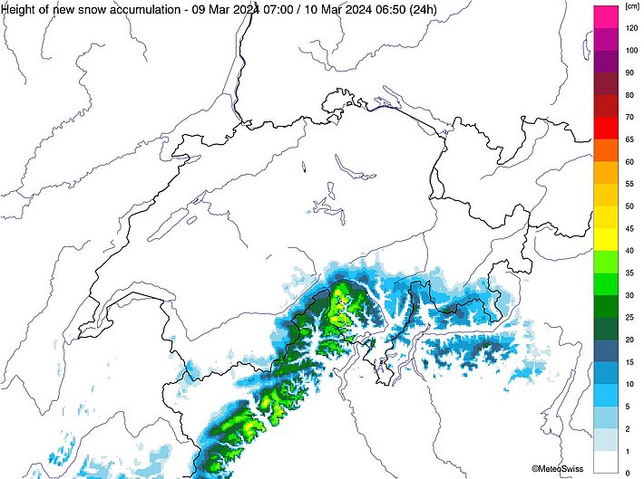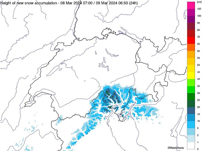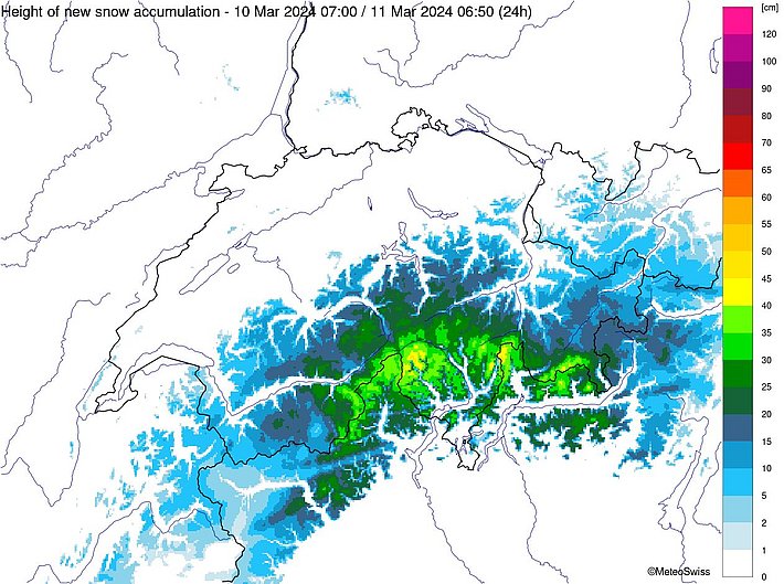 Seit dem letzten AvaBlog schneite es von Dienstagnachmittag, 05. März bis in die Nacht auf Donnerstag, 07. März oberhalb von 1500 m am Nördlichen Alpenkamm, aber auch vom Avers bis ins Berninagebiet verbreitet 30 bis 50 cm, von der Gemmi bis zur Reuss sogar bis zu 80 cm. Sonst fielen 15 bis 30 cm Schnee (Abbildung 1).