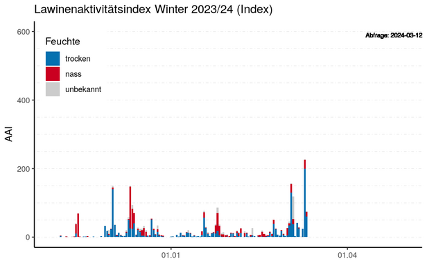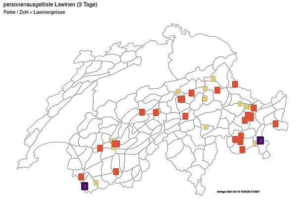 Der Sonntag, 10. März war der Tag mit der bisher grössten Lawinenaktivität dieses Winters (Abbildung 14). Am Montag, 11. März beruhigte sich die Situation und es wurde nur noch von Zermatt bis ins Binntal vor einer grossen Lawinengefahr (Stufe 4) gewarnt.