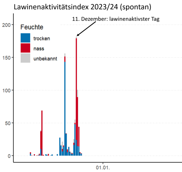 Mit dem intensiven Niederschlag und der zunächst hohen Schneefallgrenze wurde bis am Donnerstagmorgen, 14. Dezember im Westen und Norden in vielen Gebieten mit Stufe 4 (grosse Lawinengefahr) gewarnt (vgl. Abbildung «Gefahrenentwicklung» ganz unten). Mit der Abkühlung nahm die Lawinenaktivität am Mittwoch, 13. Dezember deutlich ab (vgl. Abb 7). Dennoch gab es weiterhin einzelne grosse oder sehr grosse Lawinen, wie z. Bsp. im Valle de la Sionne (vgl. Bildstrecke oben).