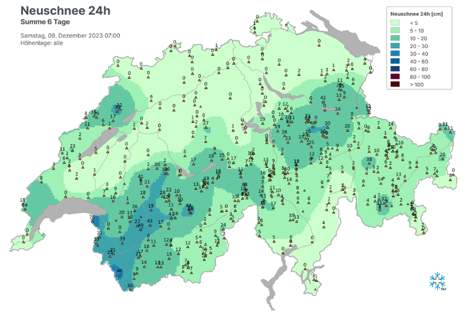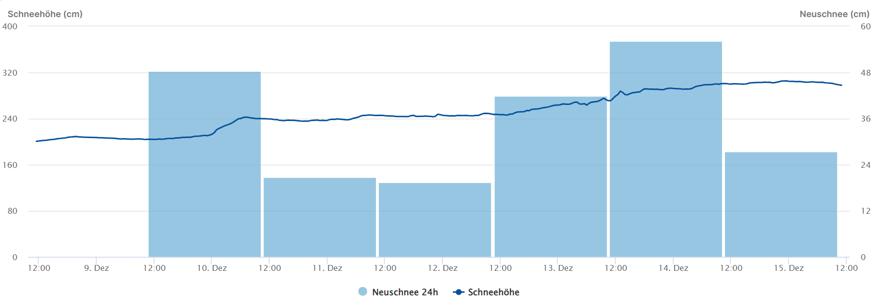 Seit dem letzten AvaBlog vom Montag, 4. Dezember schneite es wiederholt aber zunächst wenig intensiv. Bis zum Samstag, 9. Dezember fielen stellenweise 20 bis 40 cm Neuschnee (Abbildung 1).