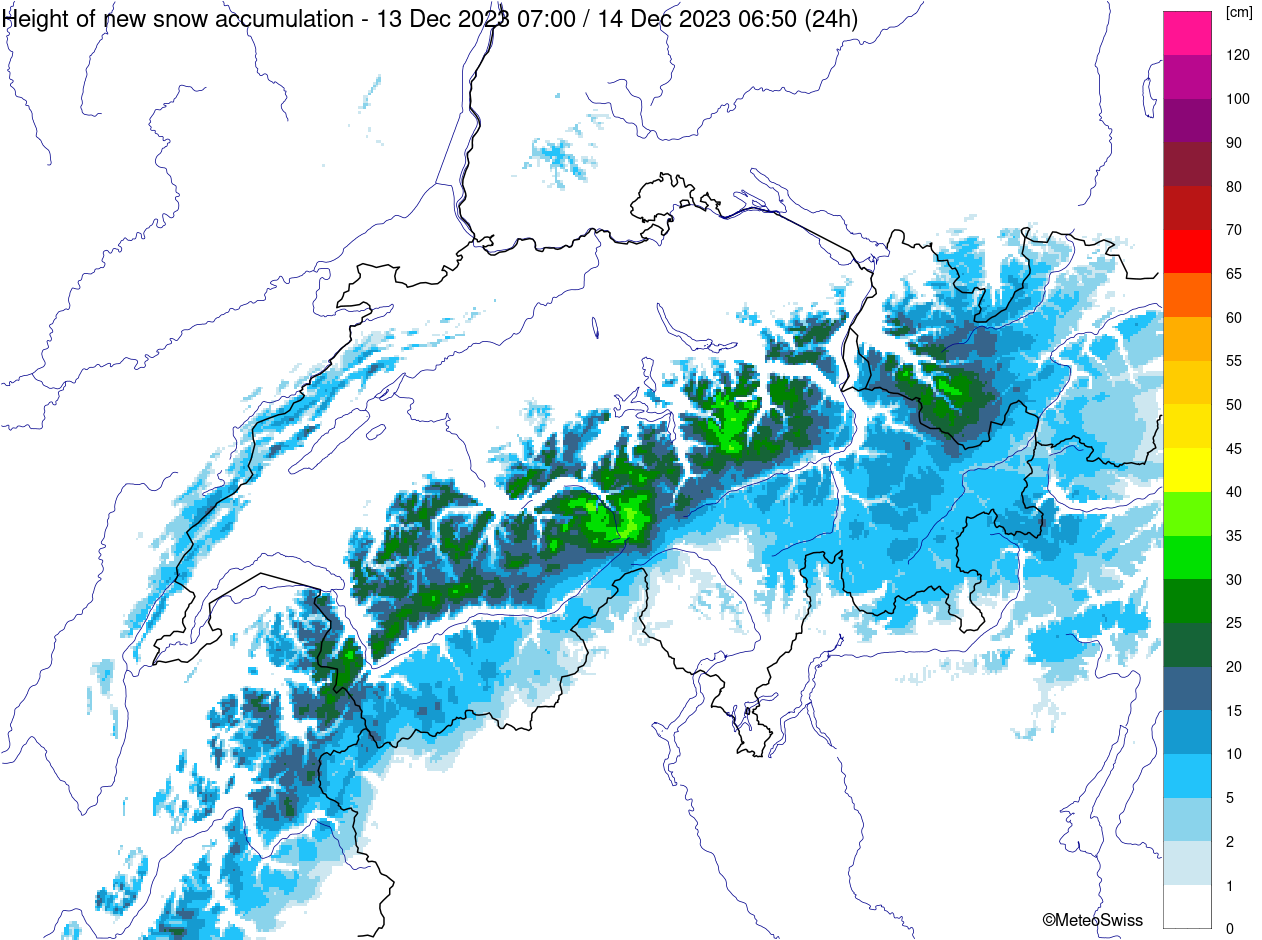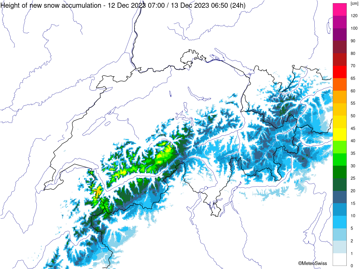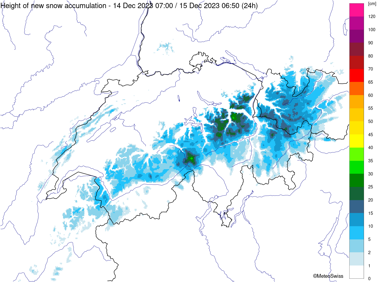 Von Sonntag bis Freitag, 10. Bis 15. Dezember fielen somit oberhalb von rund 2500 m am Nördlichen Alpenkamm und im westlichsten Unterwallis rund 1.5 bis 2 m Neuschnee. An der Station Grand Cor (2602 m) wurden insgesamt 224 cm Neuschnee gemessen (vgl. Abbildung 4).