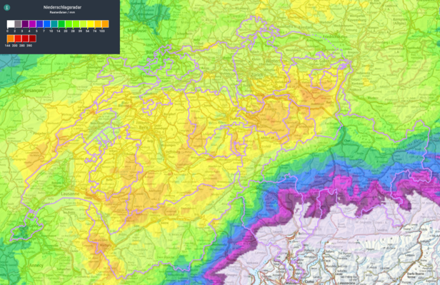 Am Montag und Dienstag fiel im Westen und Norden erneut intensiver Niederschlag. Die Schneefallgrenze lag am Montag vorerst bei rund 2000 m, stieg in der Nacht auf Dienstag verbreitet auf etwa 2500 m und lag am Dienstag tagsüber bei 2800 m.