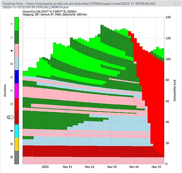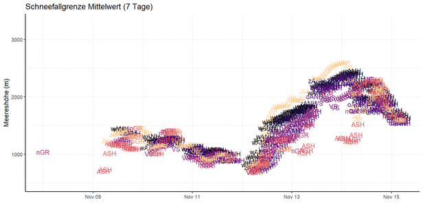 Am Mittwoch, 15. November stiegen die Schneehöhen aber wieder an, bei sinkender Schneefallgrenze und gebietsweise 10 bis 20 cm Neuschnee (Abbildung 4).