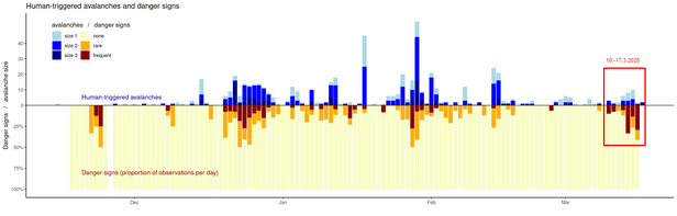 Durch die längere Schlechtwetterperiode konnte es zudem in Vergessenheit geraten, dass schon Frühling war und die Sonne viel Kraft hatte. Mit viel diffuser Strahlung während den bewölkten Tagen und mit der Sonneneinstrahlung während kurzer Aufhellungen wurden in den neuschneereichen Gebieten vor allem an Sonnenhängen Lockerschneelawinen und Gleitschneelawinen beobachtet (vgl. Bildstrecke).