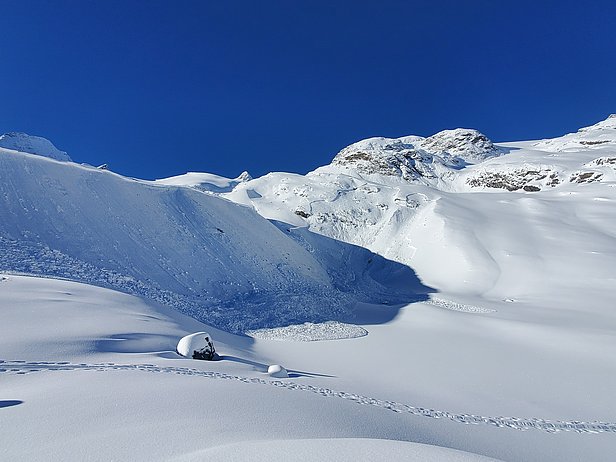 Im Wallis, im Tessin und in Graubünden waren tiefe Schneeschichten nach wie vor kantig aufgebaut, locker und störanfällig (Abbildung 3). Vor allem an Schattenhängen rissen Lawinen besonders in Graubünden in diese tiefen Schichten der Schneedecke durch (Abbildung 4).