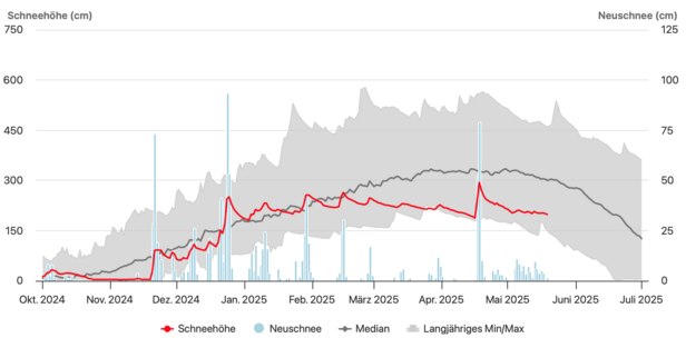 Am 10. Mai wurde das letzte ordentliche Bulletin der Saison 2024/25 publiziert. Im Hochgebirge trafen Tourengänger weiterhin auf winterliche Verhältnisse (Abb. 1). Das Tagesgangwetter der vergangenen Woche führte wiederholt zu lokalen Schneeschauern. Mit Wind aus nördlichen Richtungen entstanden im Hochgebirge teils störanfällig Triebschneeansammlungen.
