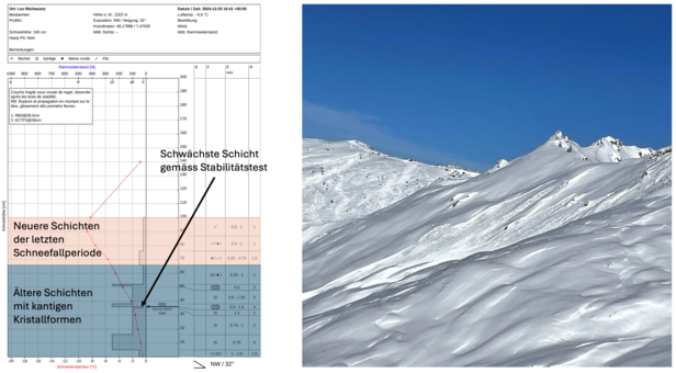 Bereits vor dem grossen Schneefall über Weihnachten war absehbar, dass die Altschneedecke ein sehr schlechtes Fundament bieten würde. Viele Profile zeigten Schichten mit kantigen Kristallen, in den schneearmen südlicheren Gebieten war gar die komplette Schneedecke aufbauend umgewandelt. Die aufbauende Umwandlung der Schneekristalle ist typisch nach vielen langen, klaren Nächten: Durch die Abstrahlung in der Nacht kühlt sich die Schneeoberfläche stark ab und ist dann deutlich kälter als der untere Teil der Schneedecke. Der dadurch entstandene Temperaturgradient führt dazu, dass sich der Schnee umwandelt und kantige Kristalle wachsen. Diese grossen, kantigen Kristalle haben nur wenige Bindungen zueinander und bilden deshalb eine prominente Schwachschicht. Mit dem Schneefall über Weihnachten (siehe AvaBlog vom 25.12.) kam dann die notwendige Überdeckung hinzu - und fertig war die Schichtkombination für Schneebrettlawinen (Abb. 5).