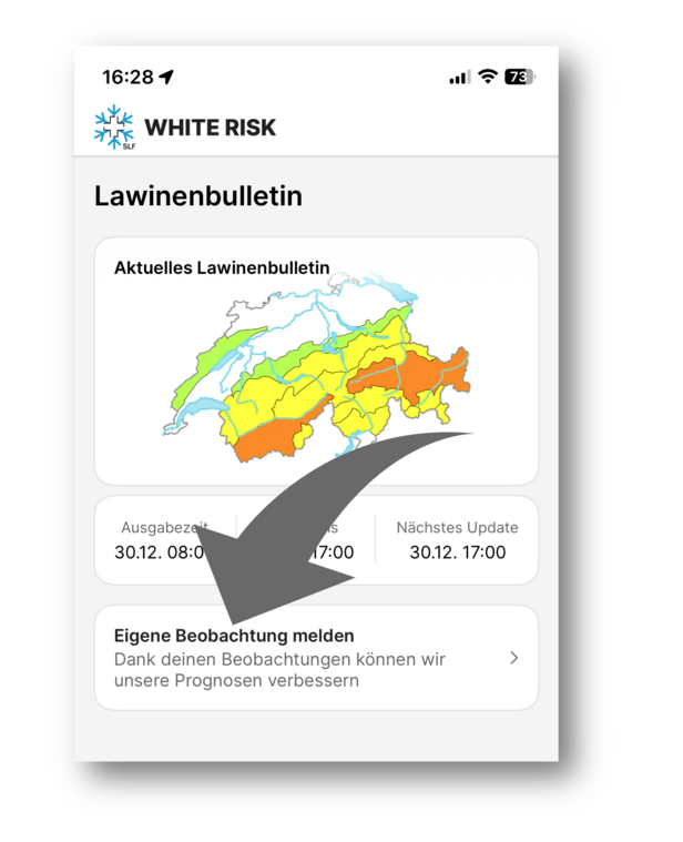 Rückmeldungen zur Lawinensituation über die SLF-App White Risk (Abb. 8) sind sehr willkommen, gerne auch mit Foto. Damit hilfst du uns substanziell bei der Erstellung des Lawinenbulletins – vielen Dank!