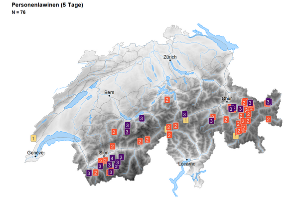 Während in den Tagen davor (siehe Avablog vom 25.12.) viele Lawinen spontan niedergegangen waren, stand in dieser Woche Lawinenauslösung durch Schneesportler im Vordergrund. Dem SLF wurden viele Personenlawinen gemeldet, 76 in nur 5 Tagen (Abb. 3). In Wirklichkeit dürfte die Zahl der ausgelösten Lawinen aber noch deutlich höher liegen.
