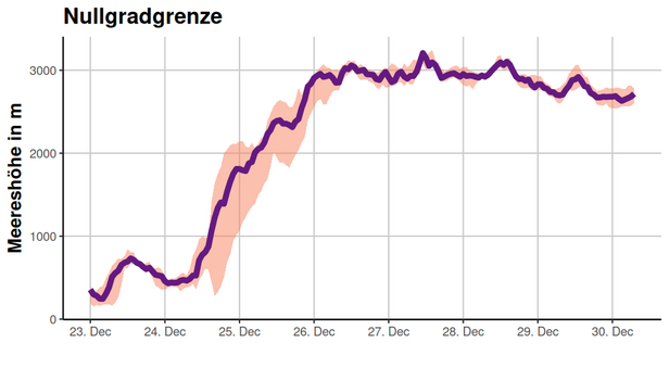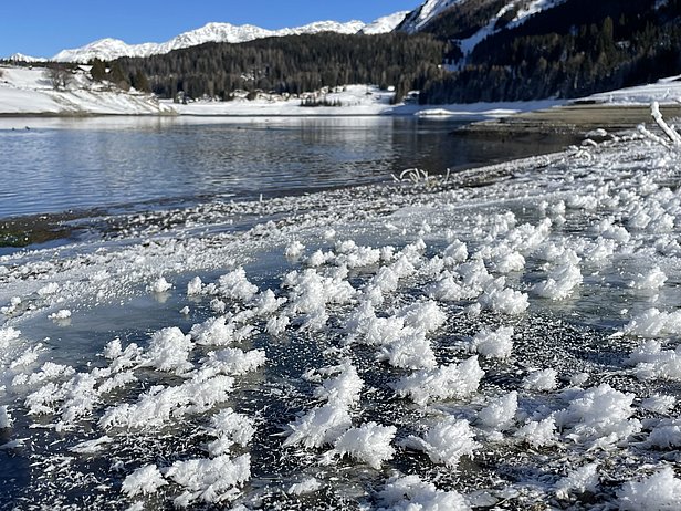 Das Wetter ist schnell zusammengefasst: In den Bergen war es sonnig, schwachwindig und aussergewöhnlich mild für diese Jahreszeit. Die Nullgradgrenze lag bei 3000 m (Abb. 1). An schattigen Hängen merkte man aber wenig von den milden Temperaturen. Bei wolkenlosem Himmel strahlte die Schneeoberfläche so viel Wärme ab, dass sie selbst in tiefen Lagen pulvrig blieb und sich vielerorts Oberflächenreif bildete (Abb. 2).
