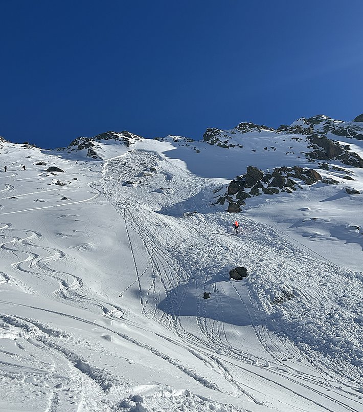 Nebst einer defensiven Touren- und Routenwahl lohnt es sich, die Schneedecke mit Entlastungsabständen und Einzelabfahrten möglichst wenig zu belasten. Damit lässt sich das Risiko einer Lawinenauslösung reduzieren. Bei den teils grossen Lawinen gibt es aber auch damit keine Garantie, dass im Falle einer Auslösung nicht mehrere Personen betroffen sein könnten. Mehr Informationen zum Risiko bei Altschnee findet sich in diesem Artikel „Fürchtet den Altschnee“.