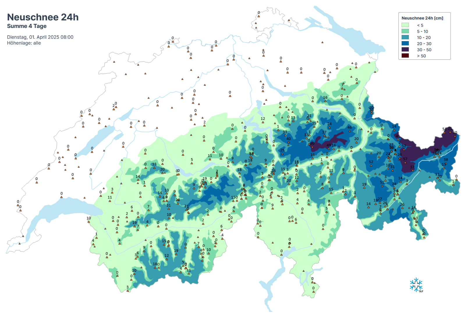 Das Wintercomeback mit deutlich tieferen Temperaturen und kalten Nordwestwinden liess das Nassschneeproblem vorübergehend ‘erstarren’. Es wurden nur einzelne Gleitschnee- und Lockerschneelawinen, vor allem am sonnigen Sonntag, 30. März gemeldet (vgl. Abbildung 6).