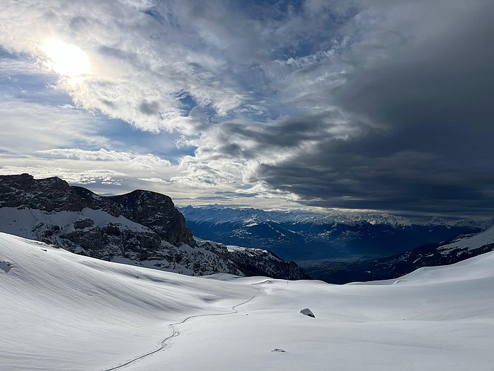 Sonst wurde die Lawinengefahr mit Stufe 2 (mässig) eingeschätzt. Dies aufgrund der kleineren, auslösbaren Neu- und Triebschneeschichten und der zum Teil noch sehr dürftigen Schneelage (vgl. unten) mit nur wenigen, grösseren zusammenhängenden Schneeflächen.