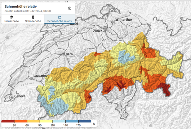 Mit den Dezemberniederschlägen hat sich die Schneearmut gegenüber dem November etwas entschärft. Im Westen und in hohen Lagen des Alpennordhanges entsprachen die Schneehöhen am Montag, 9. Dezember den sonst zu diesem Stichtag üblichen Werten (vgl. Abbildung 6). Das grösste Schneedefizit besteht immer noch im Simplongebiet, im Nordtessin, im Oberengadin und im Puschlav, wo die Schneehöhen der meisten IMIS-Stationen aktuell nahe am Minimum für die Jahreszeit liegen, d.h. bei rund 10-50 cm auf etwa 2400 m (vgl. Abbildung 6).