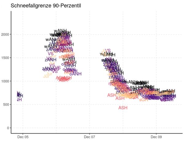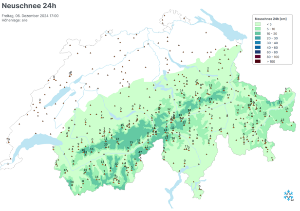 In einer ersten Niederschlagsperiode fiel von Donnerstagabend bis Freitagmittag, 6. Dezember, Schnee (vgl. Abbildung 1). Der Schneefall war begleitet von starkem bis stürmischem Wind aus westlichen Richtungen. Die Schneefallgrenze kletterte dabei am Alpennordhang und im Unterwallis vorübergehend bis 2200 m und fiel gegen Niederschlagsende auf 1500 m. In den übrigen Gebieten lag sie zwischen 1000 und 1500 m (vgl. Abbildung 2). Entsprechend fiel ein Grossteil des Niederschlags am Alpennordhang und besonders in den Voralpen als Regen, was der sonst schon dünnen Schneedecke stark zusetzte.