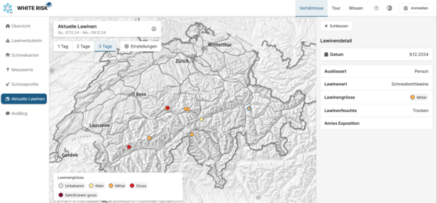 Informationen zu aktuellen Lawinenabgängen stehen auf Whiterisk allen zur Verfügung (vgl. Abbildung 8). Es werden Lawinen bis maximal 3 Tage zurück dargestellt. Mit einem Klick auf die Datenpunkte werden zusätzliche Informationen zur Lawine dargestellt. In den Einstellungen können die Lawinen anhand der gewählten Kriterien gefiltert werden. Es werden alle gemeldeten Lawinen dargestellt. Fallweise wird aber von Lawinen, die mehrfach gemeldet wurden (v.a. bei Lawinenunfällen) nur eine Meldung dargestellt. Diese Bereinigung kommt meist noch nicht am Tag der Meldung zum Zug.