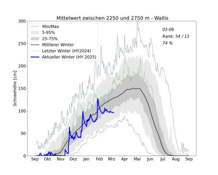 Im Gegensatz zu einem warmen und nassen Winter wie letztes Jahr waren dieses Jahr auch die hohen Lagen von der Schneearmut betroffen. Dies zeigte sich in klar unterdurchschnittlichen Schneehöhen auch in hohen Lagen (Abbildung 1). Details zu den Schneefällen an den einzelnen Stationen (.pdf)