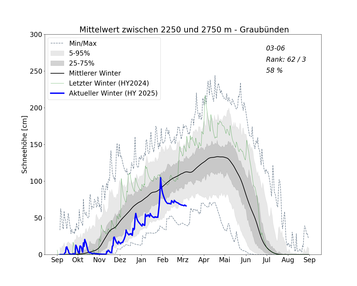 Im Gegensatz zu einem warmen und nassen Winter wie letztes Jahr waren dieses Jahr auch die hohen Lagen von der Schneearmut betroffen. Dies zeigte sich in klar unterdurchschnittlichen Schneehöhen auch in hohen Lagen (Abbildung 1). Details zu den Schneefällen an den einzelnen Stationen (.pdf)