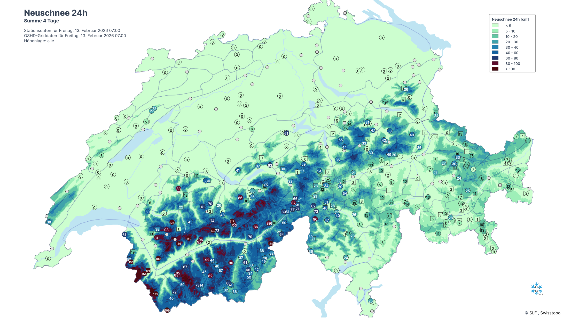In den Hauptniederschlagsgebieten im westlichsten und nördlichen Unterwallis fielen in 4 Tagen 100 bis 150 cm Neuschnee. Im übrigen Wallis vielerorts 60 bis 100 cm. Etwas unerwartet fiel auch im westlichen Tessin recht viel Neuschnee.