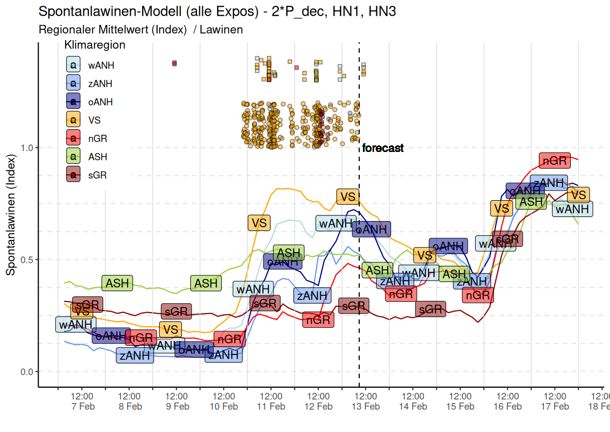 Wenn viel Neuschnee auf eine derart schwache Altschneedecke abgelagert wird, steigt die Lawinengefahr rasch und markant an. So wurde bereits ab Dienstagabend, 10. Februar im Wallis verbreitet vor grosser Lawinengefahr (Stufe 4) gewarnt und es gingen bereits in der Nacht auf Mittwoch viele spontane Lawinen ab. Dank zahlreichen Lawinendetektionssystemen konnte die spontane Lawinenaktivität über die gesamte Niederschlagsperiode gut verfolgt werden (Abbildung 3).