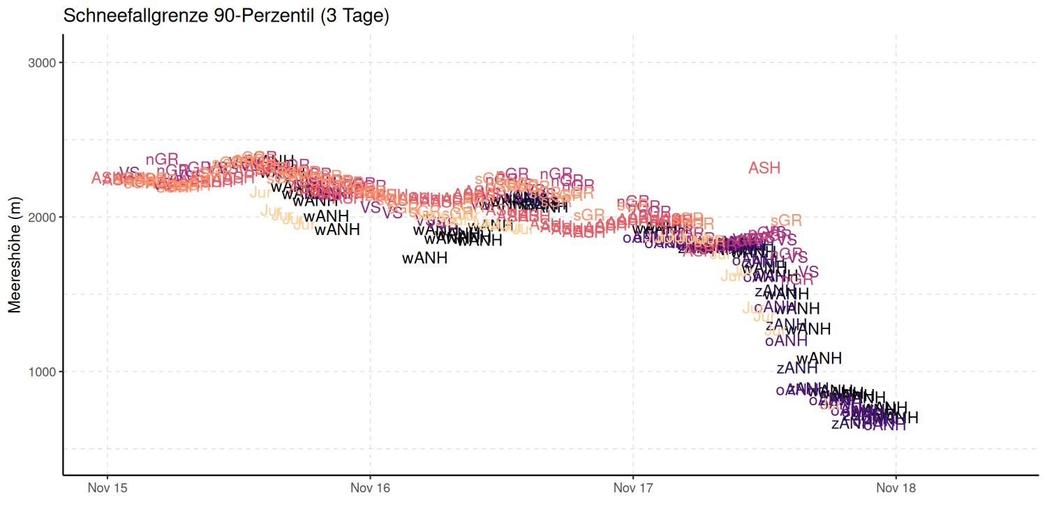 Am Samstag, 15. November setzten zunächst im Süden, später auch im Norden, Niederschläge ein. Die Schneefallgrenze lag zunächst auf 2000 m und sank in der Nacht auf Dienstag, 18. November mit dem Ende des Schneefalls auf rund 700 m (vgl. Abbildung 2).