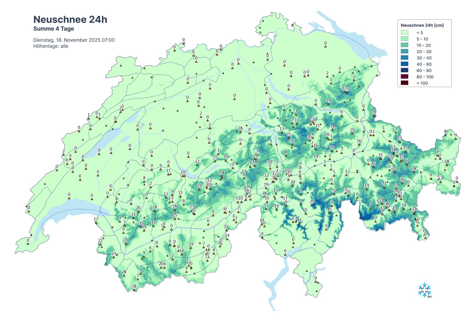 In hohen Lagen fiel vom mittleren Tessin bis zum Berninagebiet und südlich davon bis zu einem halben Meter Neuschnee. Am Alpennordhang sowie in Nord- und Mittelbünden kamen 15 bis 30 cm Neuschnee zusammen, in den übrigen Gebieten weniger (vgl. Abbildung 3).
