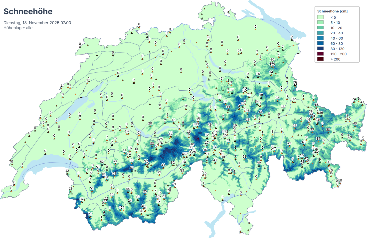 Vor den Schneefällen dieser Berichtsperiode lag an Nordhängen oberhalb von rund 2200 m, an Südhängen oberhalb von rund 2800 m eine zusammenhängende Schneedecke (vgl. Abbildung 4).