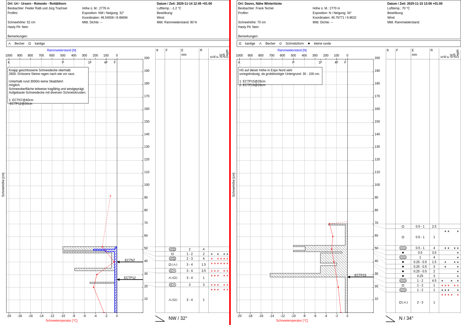 Nach zwei Wochen sonnigem und trockenem Wetter fiel in dieser Berichtsperiode in den meisten Gebieten Schnee. Der Neuschnee wurde vor allem an Schattenhängen oberhalb von rund 2200 m und allgemein im Hochgebirge auf ausgeprägte Schwachschichten abgelagert. Es gab erst wenige Rückmeldungen aus dem Gelände. Diese bestätigten aber teils den ungünstigen Schneedeckenaufbau (vgl. Abbildung 1).