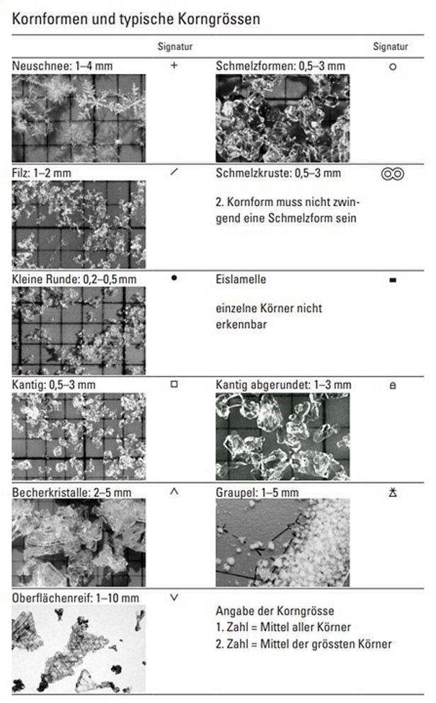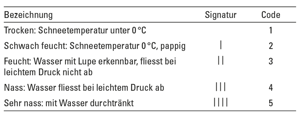 Typischerweise ist die Schneedecke im Hochwinter kälter als 0 °C und damit trocken. Einzig am Übergang zum Boden ist der Schnee oft auch dann 0 °C „warm“. Für die Bestimmung der Feuchtigkeit wird folgende Skala verwendet: