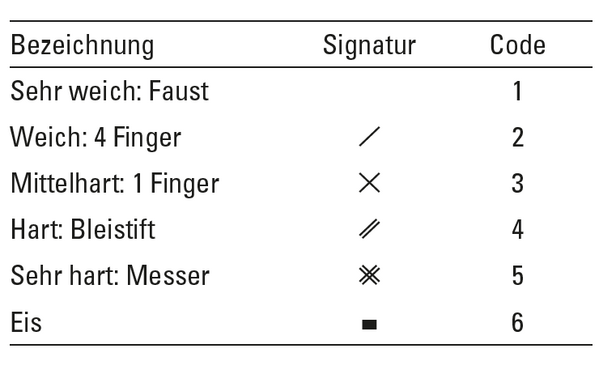 Die Härte der Schichten wird zusätzlich manuell pro Schicht bestimmt. Für die Bestimmung der Handhärte werden die Faust, 4 Finger, 1 Finger, ein Bleistift bzw. ein Messer verwendet.
