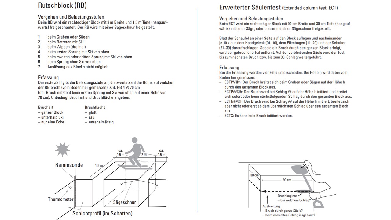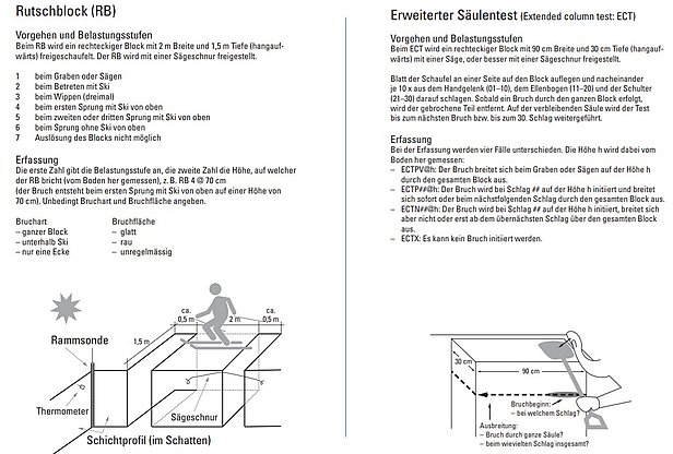 Der Rutschblock-Test (RB) ist der zuverlässigste Stabilitätstest. SLF-Beobachter führen bei den Hangprofilen in der Regel einen Rutschblock-Test durch, manchmal zusätzlich auch einen oder zwei Extended Column Tests (ECT). Dabei gehen sie nach der untenstehenden Anleitung vor. Ein Rutschblock oder ECT liefern Informationen, wie leicht sich ein Bruch am Profilort erzeugen liess und wie gut sich dieser ausbreitete. Die Testresultate sind die Grundlage der Klassierung der Schneeprofile.
