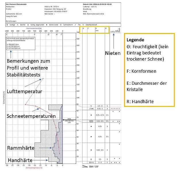 Das Rammprofil wird mit einem speziellen Gerät, der so genannten Rammsonde erstellt. Es ist ein objektives Mass für die Schichthärten, kann dünne schwache Schichten aber nicht erfassen. Es misst die allgemeine Verfestigung der Schneedecke und hilft auch abzuschätzen, wie viel Schnee eine Lawine in der Sturzbahn mitreissen kann.