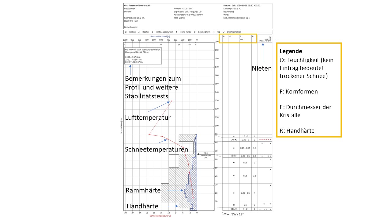Die Karte «Schneeprofile» gibt keine flächige Information zur Schneedeckenstabilität sondern ist eine Sammlung von Punktaufnahmen. Schneeprofile sind die einzige Möglichkeit, ein detailliertes Bild des Schneedeckenaufbaus zu erhalten. In Kombination mit einem oder mehreren Tests kann die Schneedeckenstabilität abgeschätzt werden. Ein repräsentativer Profilstandort ist wichtig. Auch bei guter Standortwahl können die gesammelten Informationen aufgrund der räumlichen Variabilität der Schneedecke nur beschränkt auf andere Hänge übertragen werden.