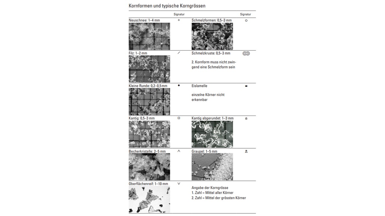 Pro Schicht werden visuell mit einer Lupe die Kornformen und die Korndurchmesser bestimmt. Typische Schwachschichten bestehen aus grossen, kantigen Körnern, denn diese sind meistens schlecht miteinander verbunden. Kantige Körner haben weniger Bindungen zueinander als runde; grosse Körner haben – pro Volumen – weniger Verbindungen als kleine.