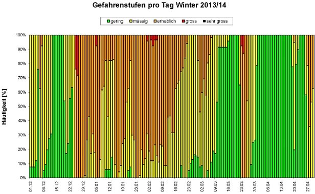 Wie die Verteilung der Gefahrenstufen (Abbildungen 31 und 32) zeigt, war der Winter 2013/14 weniger gefährlich als ein Winter, der dem langjährigen Mittelwert entspricht. Seit dem Winter 1997/98 (17 Winter) wurde die Stufe 1 (gering) noch nie so häufig (27% im Winter 2006/07), die Stufe 2 (mässig) erst ein Mal (Winter 2008/09) so selten verwendet. Diese Verteilung, insbesondere die Häufigkeit der Stufe 1 (gering), ist der lange anhaltenden, günstigen Situation in der ersten Dezemberhälfte sowie im März und April zuzuschreiben.