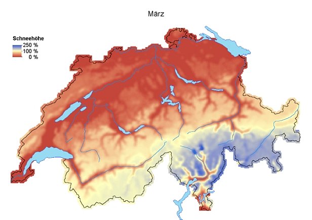 Schnee fiel im März nur zum Monatsanfang und –ende mit Schwergewicht vom Simplongebiet bis ins westliche Tessin sowie am östlichen Alpennordhang, im nördlichen Tessin und im Oberengadin mit je etwa 60 bis 80 cm. Sonst war der März geprägt von sonnigem und mildem Wetter. Die Schneehöhen über den ganzen Monat betrachtet waren im Verhältnis zur Jahreszeit auch im März ähnlich wie im Januar (Abbildung 5, oben). Auch anfangs März traten an Stationen im Süden neue Schneehöhenmaxima auf, dann nahm die Schneehöhe aber vor allem bis in mittlere Höhenlagen durch Schmelze deutlich ab. Am Alpennordhang erreichten die Schneehöhen gegen Ende Monat deutlich unterdurchschnittliche Werte. Einige wenige Stationen mit langjährigen Messreihen verzeichneten dort neue Schneehöhenminima.