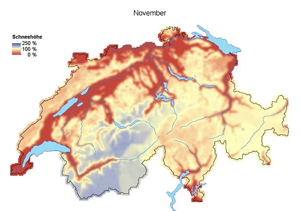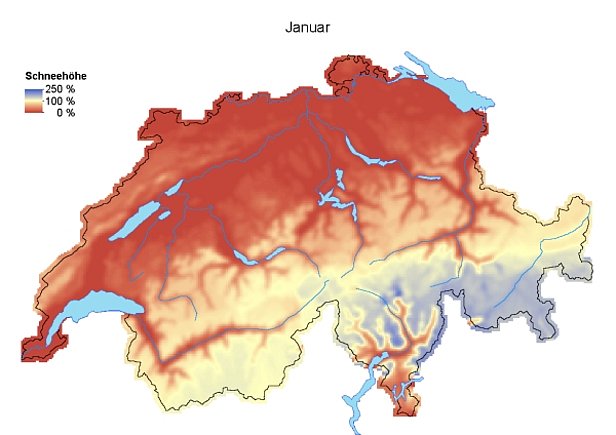 - lagen die Schneehöhen im Vergleich zum langjährigen Mittel deutlich unter dem Durchschnitt (meist 30 bis 60% oder weniger)