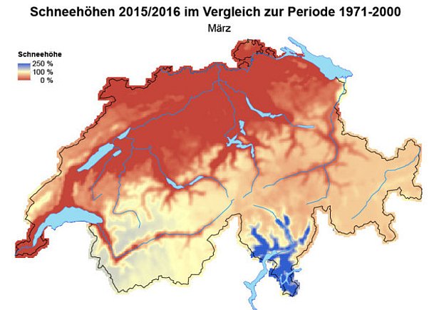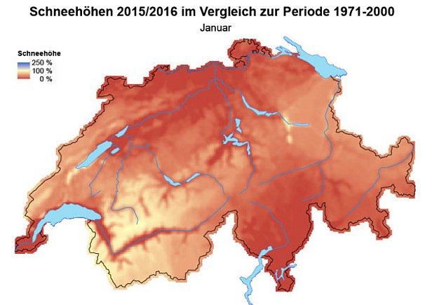 Die Schneehöhen, in Abbildung 5 illustriert, waren im Winter 2015/16 im Westen der Schweizer Alpen durchschnittlich, im Osten und Süden unterdurchschnittlich, ganz im Süden stark unterdurchschnittlich.
