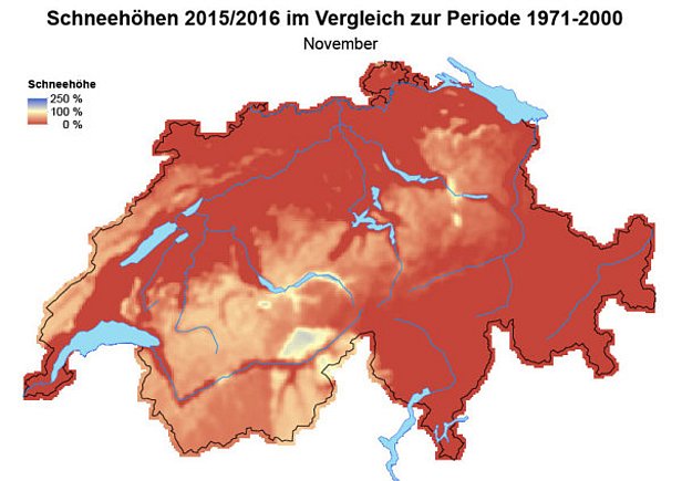Die frühwinterliche Schneearmut in diesem Winter (2015/16) war sogar noch ausgeprägter als die im vorangehenden Winter (2014/15). Mit Ausnahme des März fielen alle anderen Monate (November 2015 bis April 2016) zu warm aus. Vor allem der Dezember war rekordwarm - laut MeteoSchweiz wurden in Berggebieten 4 bis 6 °C höhere Temperaturen als im Durchschnitt (1981-2010) gemessen. In den Monaten November und Dezember fiel zudem sehr wenig Niederschlag, während die nachfolgenden zwei Monate einen leichten Niederschlagsüberschuss aufwiesen.