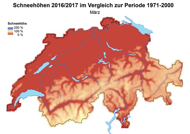 Im Winter 2016/17 war der Frühwinter zum dritten Mal in Folge praktisch schneelos. Der Dezember war extrem warm und trocken, und wie schon letztes Jahr gab es in vielen Wintersportorten grüne Weihnachten. In den nachfolgenden Monaten schneite es, abgesehen von Anfang März, relativ wenig. Die grosse Wärme im März liess die vielerorts dünne Schneedecke schnell wieder wegschmelzen. Die Schneearmut war dadurch noch ausgeprägter als während der letzten beiden Winter, da an vielen Orten die Zeit mit einer durchgehenden Schneedecke sehr kurz war.