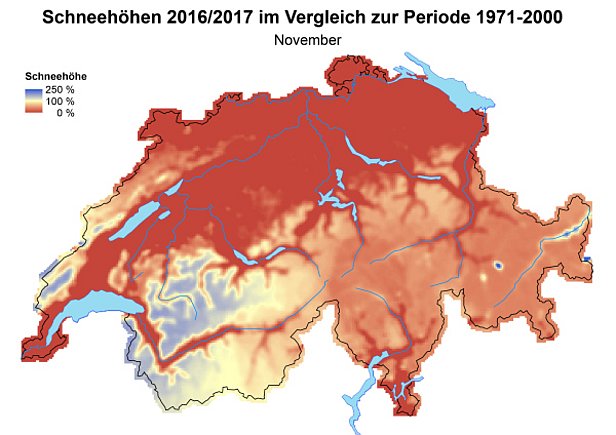 Der November war zunächst winterlich kalt, dann spätsommerlich mild und im Durchschnitt etwas kälter als normal. Nach zwei Wintereinbrüchen mit ergiebigen Schneefällen in der ersten Novemberhälfte im Norden und Westen lag dort verbreitet in mittleren Lagen eine geschlossene Schneedecke, auch im Jura. In der zweiten Novemberhälfte brachte eine anhaltende Südstaulage ergiebige Niederschläge am Alpensüdhang, mit bis zu 200 cm Schnee oberhalb von 2400 m im nördlichen Tessin und im Simplongebiet. Die dadurch gebildete Schneedecke war aber nur von kurzer Dauer, weil der anschliessend mehrtägige Föhn den Schnee bis weit hinauf wieder wegschmolz. Ende November lag auf 2500 m im nördlichen Wallis und am Walliser Alpenhauptkamm sowie am Alpensüdhang ohne Münstertal 50 bis 100 cm, im Simplongebiet bis 180 cm Schnee. Sonst lag verbreitet 20 bis 50 cm Schnee. Über den ganzen November gesehen waren die Schneehöhen im Westen und im Wallis durchschnittlich bis überdurchschnittlich, sonst verbreitet unterdurchschnittlich (Abbildung 7, oben).