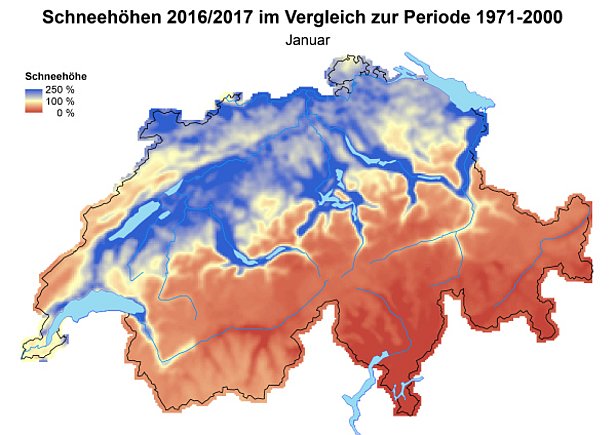 Der ersehnte Schnee fiel wie bereits im Vorjahr erst Anfang Januar und in den nachfolgenden Wochen, allerdings viel weniger Schnee als im Januar 2016. Gemäss MeteoSchweiz war es im Norden der kälteste Januar seit 30 Jahren. Dadurch fiel der Schnee bis in tiefe Lagen und am Nordrand der Alpen und im Mittelland blieb, dank der Kälte und des Nebels, wochenlang eine dünne Schneedecke liegen. In den Alpen fiel in den ersten drei Januarwochen vor allem im Norden und Westen Schnee. Mitte Januar waren die Schneefälle mit 50 bis 100 cm oberhalb von 1800 m am ergiebigsten. In der letzten Januarwoche stieg die Nullgradgrenze gegen 2000 m an. Abgesehen vom 31. Januar war es in der letzten Januarwoche weitgehend trocken und mit starkem Föhn schmolz der Schnee in den tiefen Lagen des Nordens. Im Süden hielt die extreme Trockenheit auch im Januar an. Über den ganzen Monat gesehen waren die Schneehöhen verbreitet klar unterdurchschnittlich. Am stärksten ausgeprägt zeigte sich das Januar-Defizit auf der Alpensüdseite, inklusive Engadin und Oberwallis (Abbildung 9, oben). Dagegen lagen die Schneehöhen im Mittelland, im östlichen Jura und in den Alpentälern deutlich über dem Durchschnitt. Eine solch ausgeprägte Trendumkehr zwischen „unten“ und „oben“ hat die Schweiz seit Messbeginn noch nie erlebt. Eine am ehesten vergleichbare Situation gab es letztmals im Januar 1995. Allerdings waren die Schneehöhen in den Alpen damals nur leicht unterdurchschnittlich. Ende Januar 2017 lag im Jura auf 1200 m 10 bis 30 cm, im Mittelland verbreitet 5 bis 10 cm, in Landquart (GR, 527 m) sogar 27 cm Schnee. Auf 2000 m lag im Norden und Westen 50 bis 80 cm, lokal bis 120 cm Schnee. Am Alpensüdhang, im südlichen Oberwallis, in Mittelbünden und im Engadin lag verbreitet nur 20 bis 50 cm Schnee.