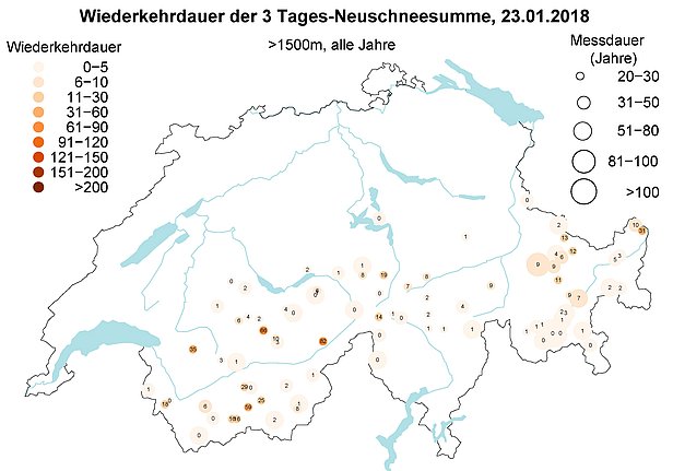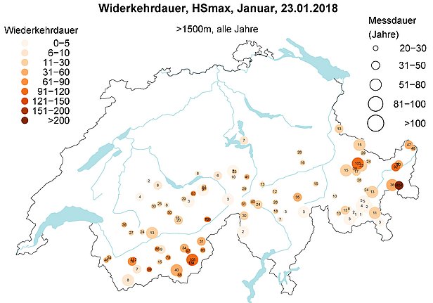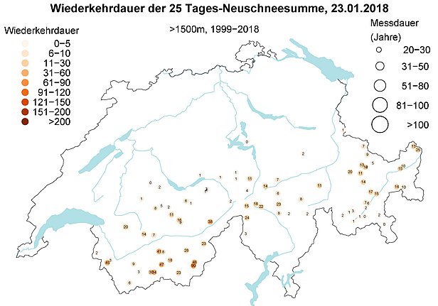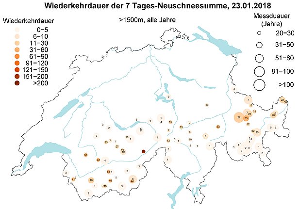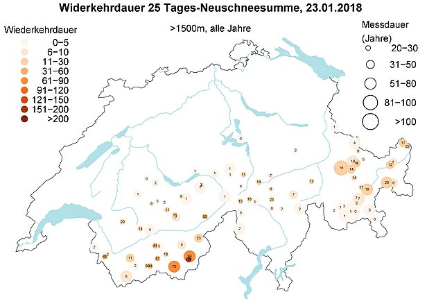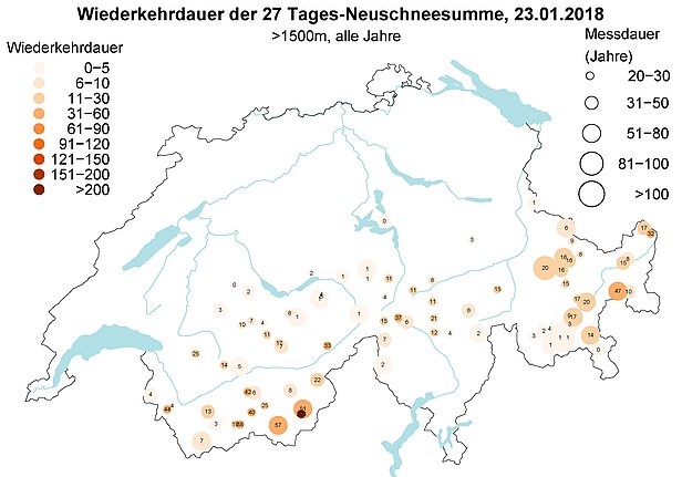 Derart grosse Schneehöhen bereits im Januar sind aussergewöhnlich und werden statistisch an vielen Stationen nur alle 20 bis 100 Jahre erwartet (Abbildung 88). Die grosse Mehrheit der Stationen (12 von 17) mit einer Jährlichkeit von mehr als 50 Jahren für die Schneehöhe im Januar befindet sich im Wallis. Der Rest der Stationen (mit einer Ausnahme) konzentriert sich im östlichen Graubünden.