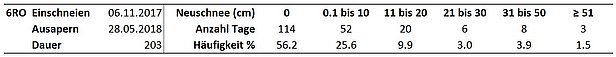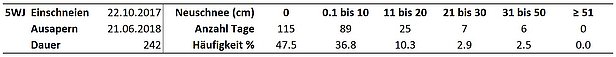 Eine durchgehende Winterschneedecke lag während 203 Tagen. In dieser Zeit wurde nur an 89 Tagen Neuschnee gemessen (44 %), dabei 8-mal zwischen 30 und 50 cm und 3 Mal über 5 cm (Tabelle 5). Der maximale Wasserwert wurde Mitte April gemessen. Er lag mit 1212 mm um fast die Hälfte über dem Durchschnitt der 44-jährigen Wasserwert-Messreihe, aber weit unter dem absoluten Maximum von 2141 mm im Winter 1985/86.