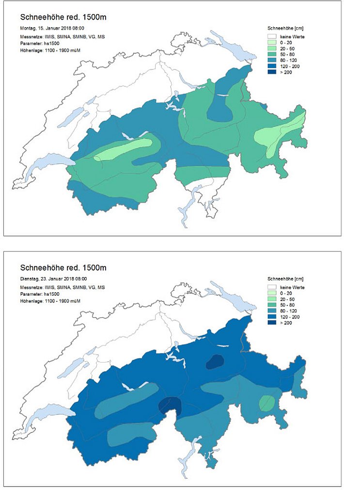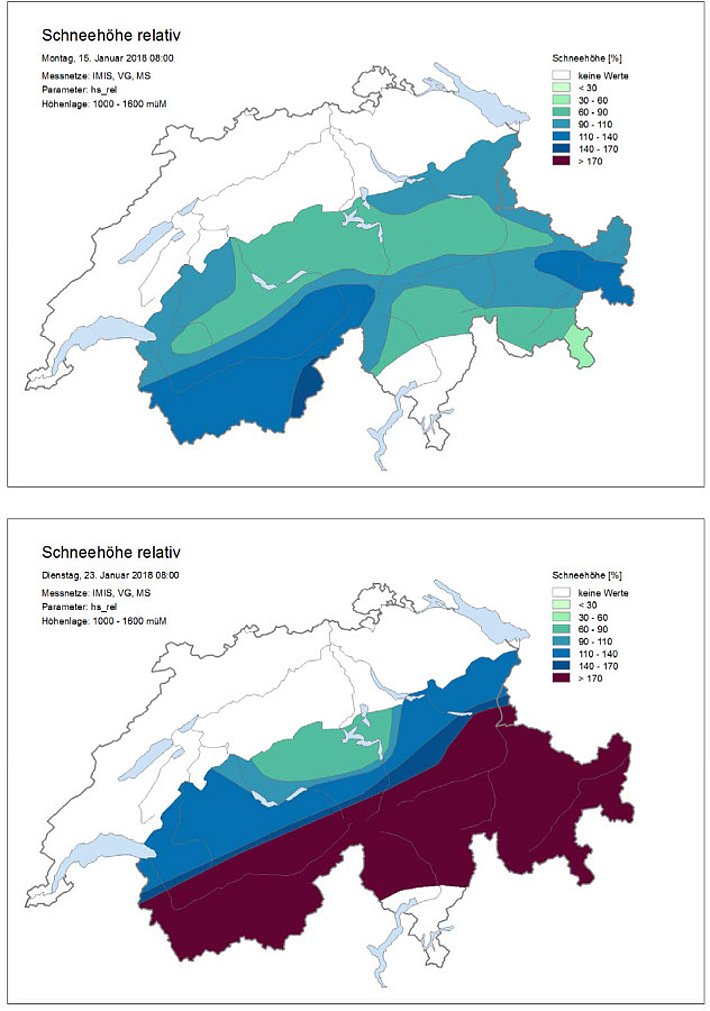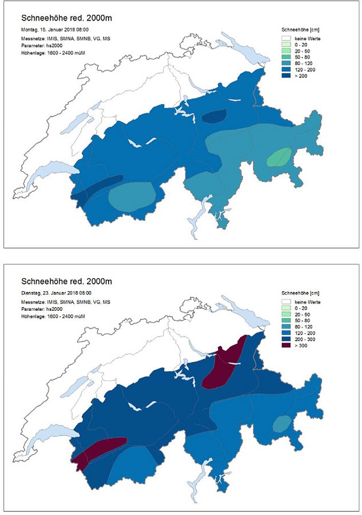 Nach einem frühen Winterstart und wiederholten Schneefällen im November und Dezember waren die Schneehöhen bereits Ende Dezember in der Höhe überdurchschnittlich. Vom 30. Dezember bis am 9. Januar fiel verbreitet viel Niederschlag. Im Norden stieg die Schneefallgrenze mehrmals auf etwa 2000 m. Mitte Januar lagen folgende Schneemengen (Abbildung 82 bis 84, jeweils oben):