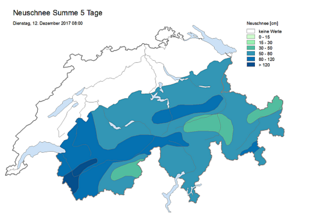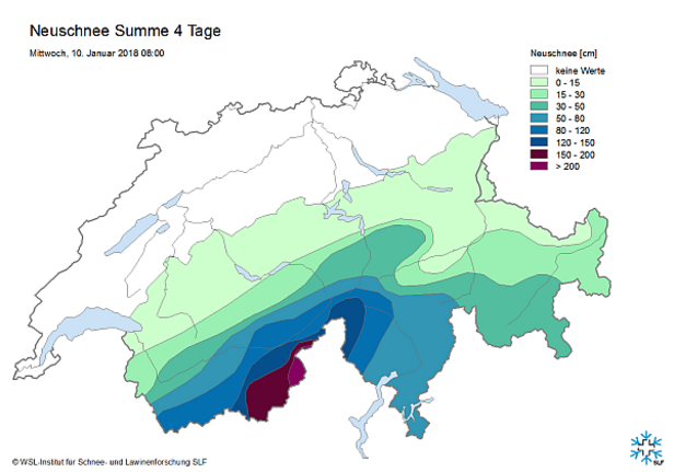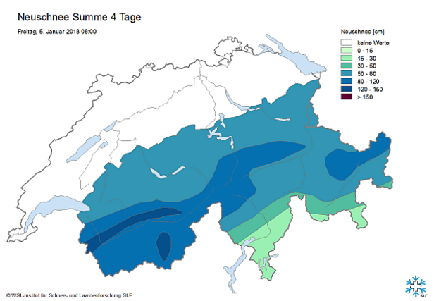 - In den ersten vier Tagen des neuen Jahrs fiel im Wallis und im Norden etwa ein Meter Schnee, mit Schwergewicht im Westen.